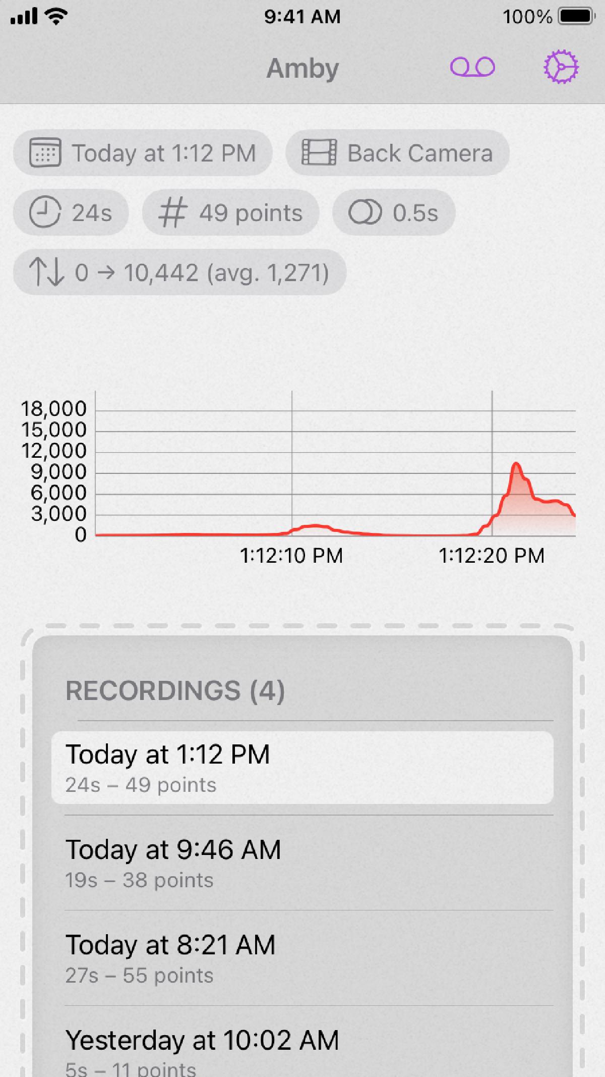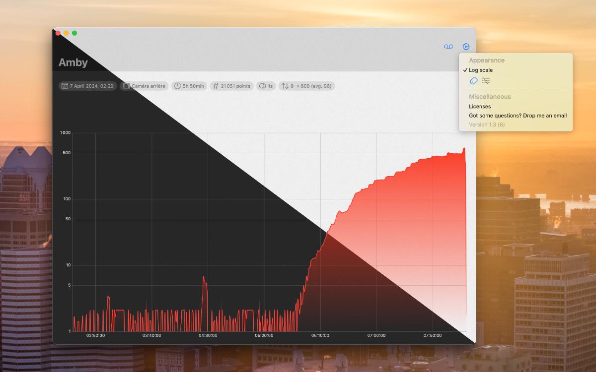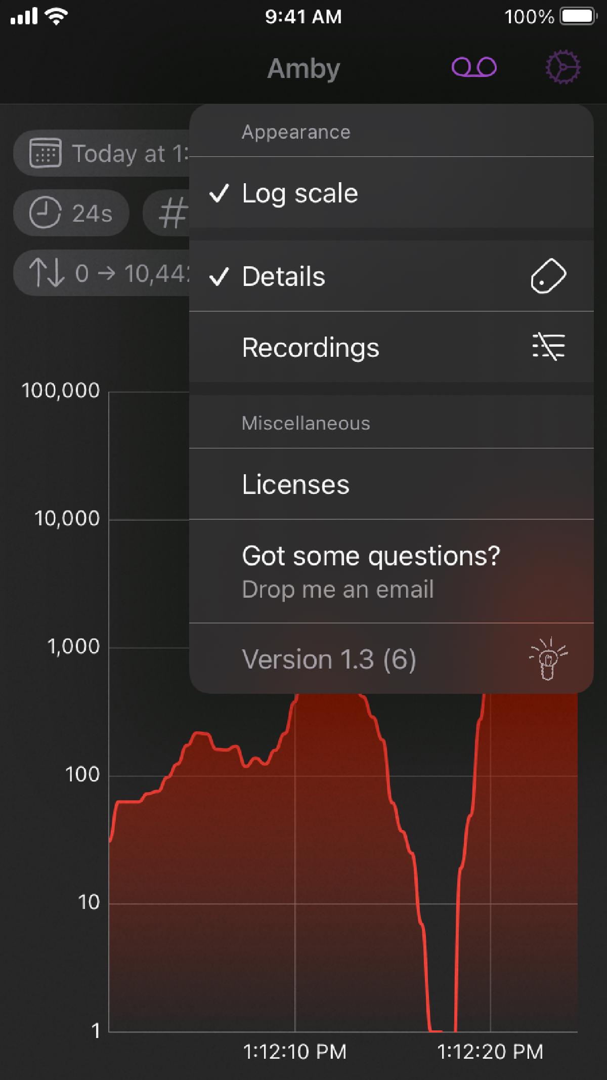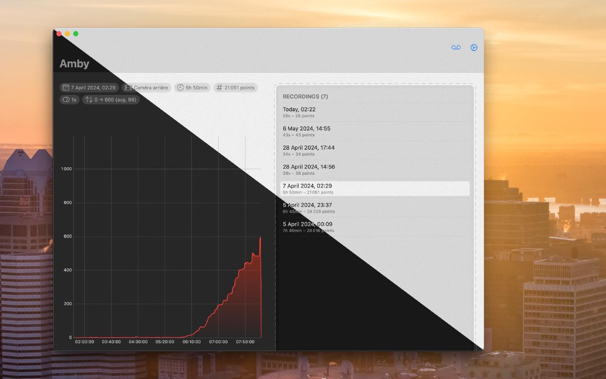 Introducing Amby, a very simple light level recorder. While a lot of apps already exist on the AppStore to determine light level, this app allows you to record it for hours if need be, and study how it evolved in that time.
