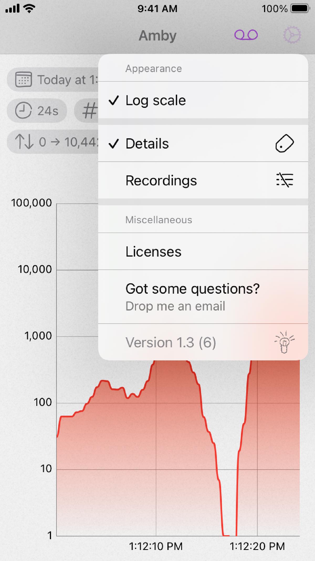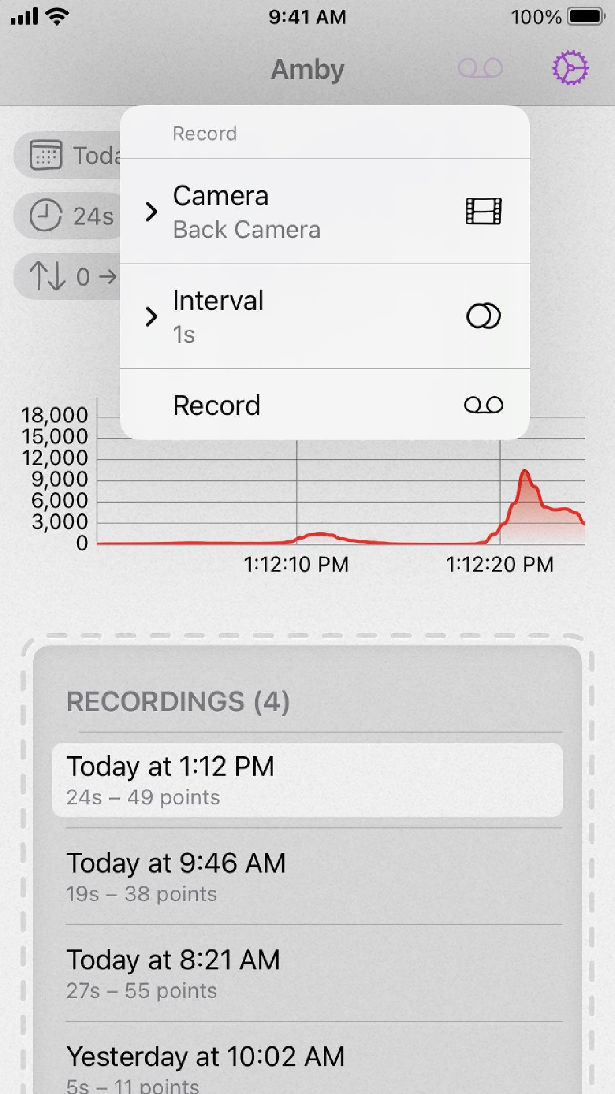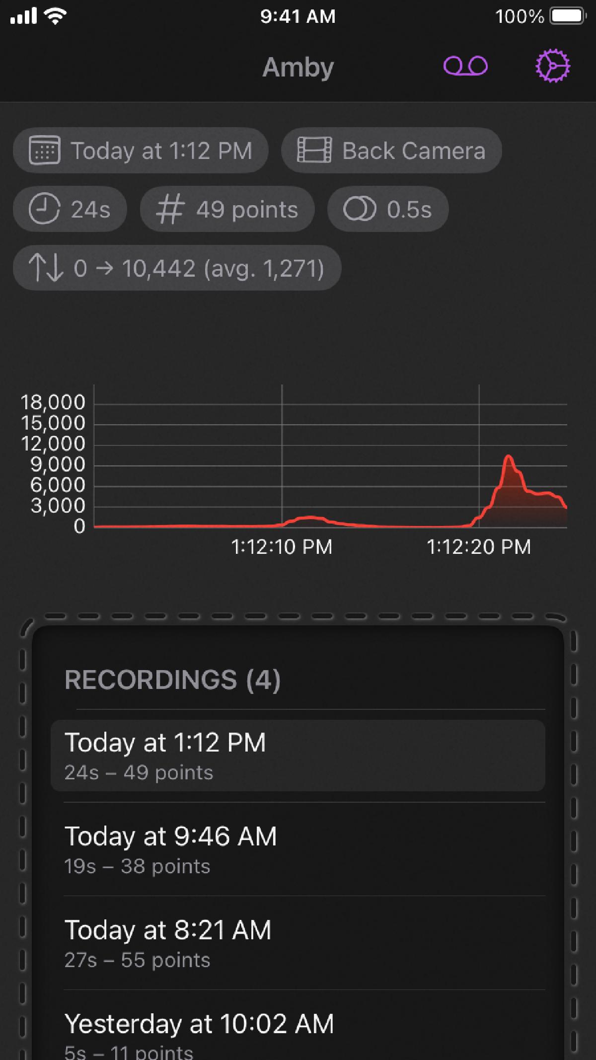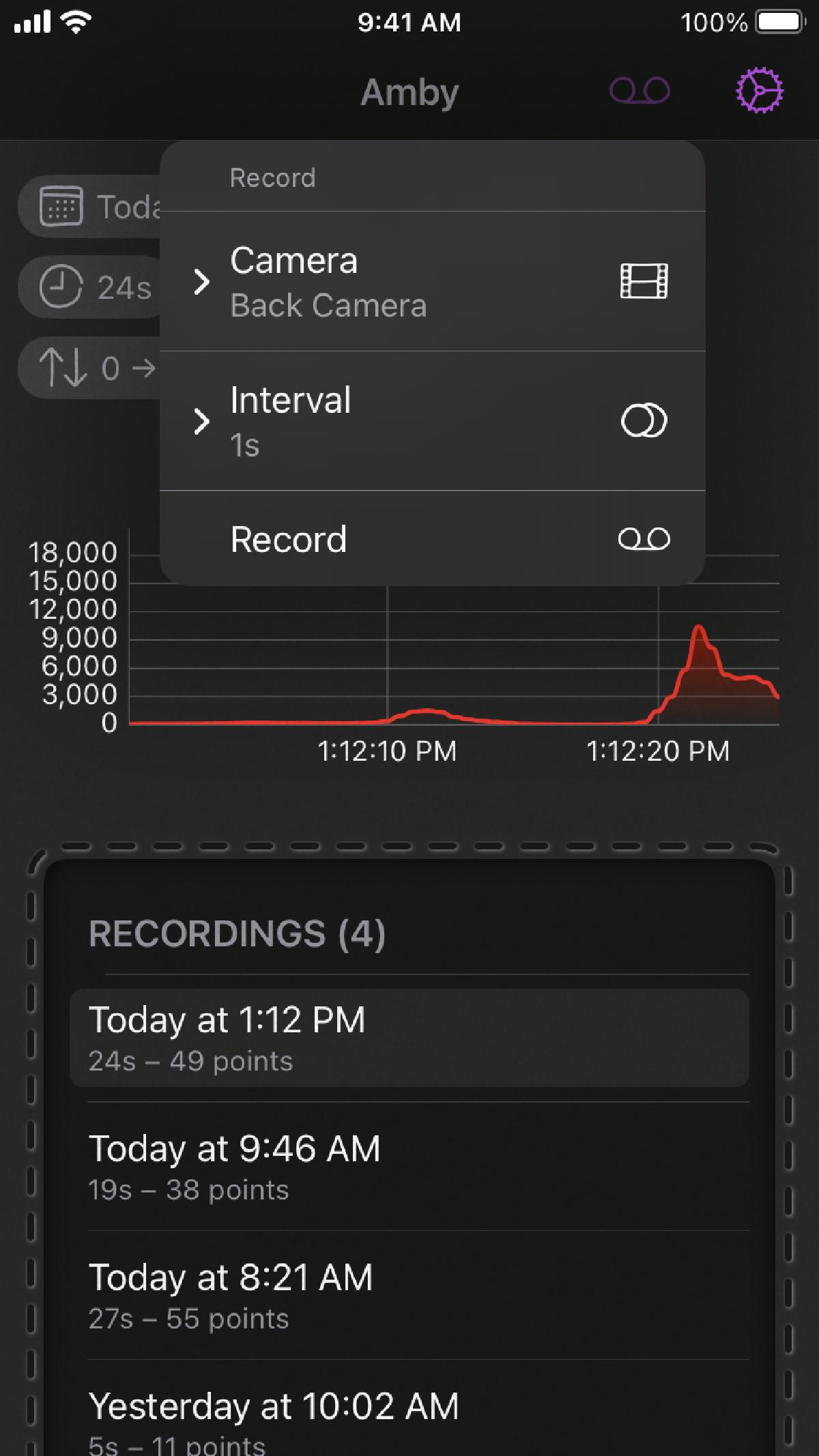 Introducing Amby, a very simple light level recorder. While a lot of apps already exist on the AppStore to determine light level, this app allows you to record it for hours if need be, and study how it evolved in that time.