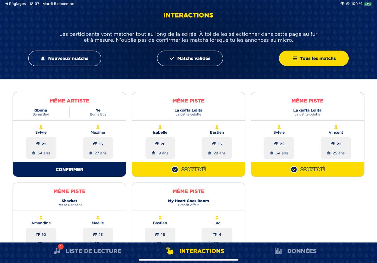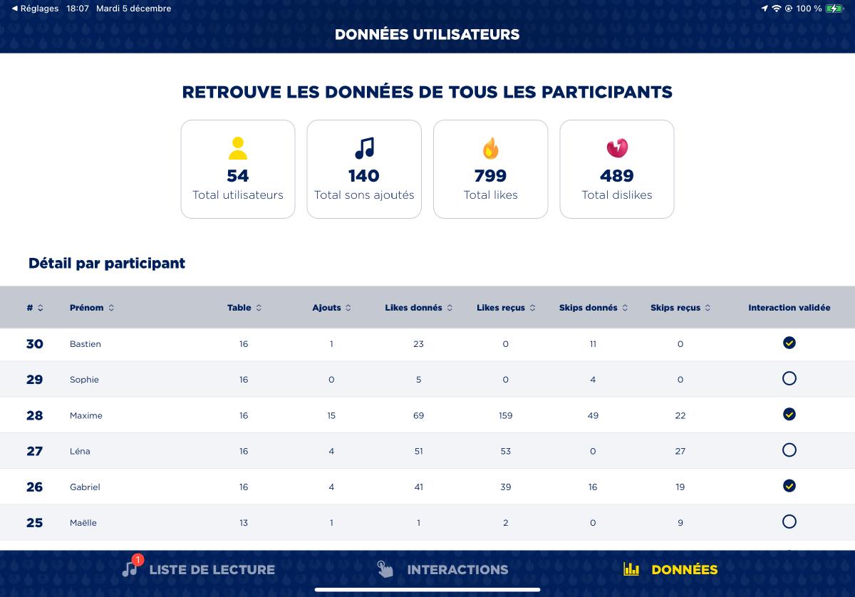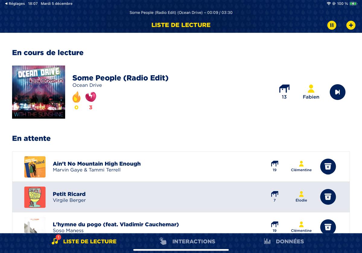 Au cours de ma période d’emploi chez LostMechanics, nous avons été sollicités pour créer une playlist collaborative pour des événements dans divers lieux de France. Notre solution ? Une application web accessible via un QR code. Après une inscription rapide, les utilisateurs peuvent ajouter des chansons à la playlist de l’événement et exprimer leurs sentiments sur la piste en cours via des likes ou des dislikes. Un animateur est en charge de la modération musicale, et peut créer se servir d’interactions telles que deux participant•e•s suggérant la même piste ou la suggestion d’une piste très likée par les autres utilisateur•ices pour ajouter à l’événement (lots, rencontres, etc).