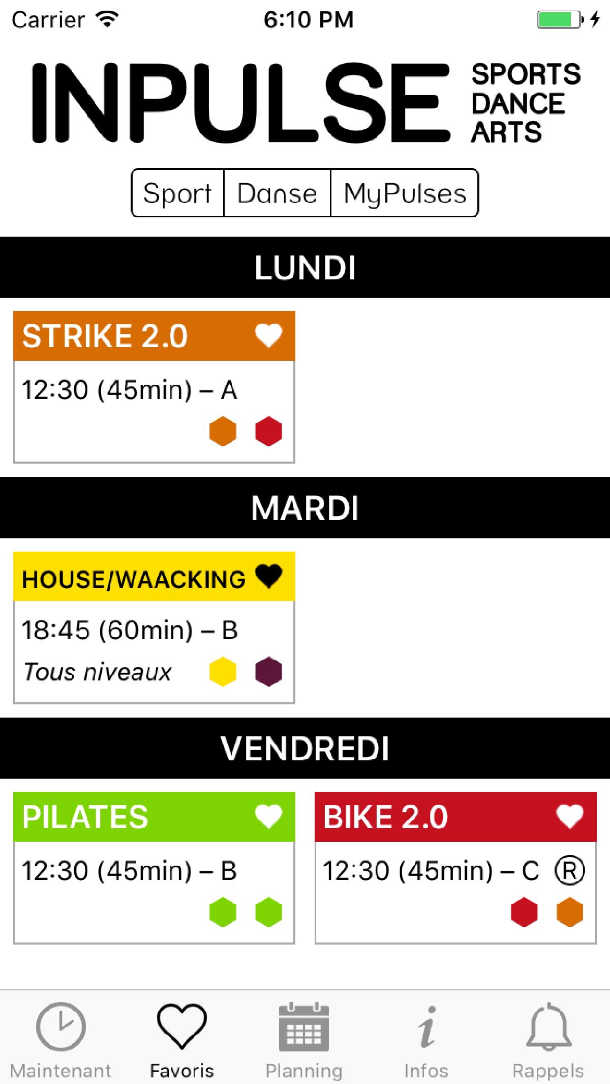 Projet bénévole pour le studio INPulse, compilant toute leur offre dans une application simple d’utilisation permettant de consulter le planning complet, mettre en favoris les cours suivis régulièrement, définir une alarme matinale pour ne pas oublier ses affaires de sport, ainsi que des rappels avant chaque cours.